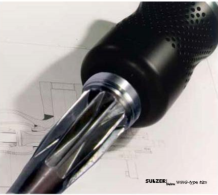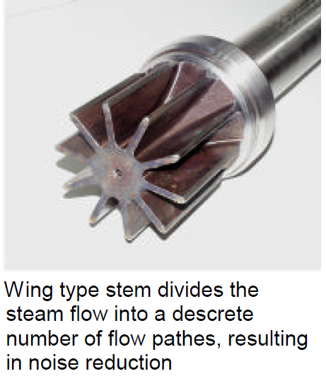 Sulzer developed the unique WING-type stem with contoured cage design for use high pressure bypass systems. Unlike conventional plug designs, the WING-type stem has a specially contoured profile to produce wave interference. This design incorporates specially engineered channels that divide the steam flow into discrete paths and increase generated noise frequency. This higher frequency noise is more easily absorbed by the adjacent piping and results in noise-level reduction of more than 10dBA as compared to conventional designs.